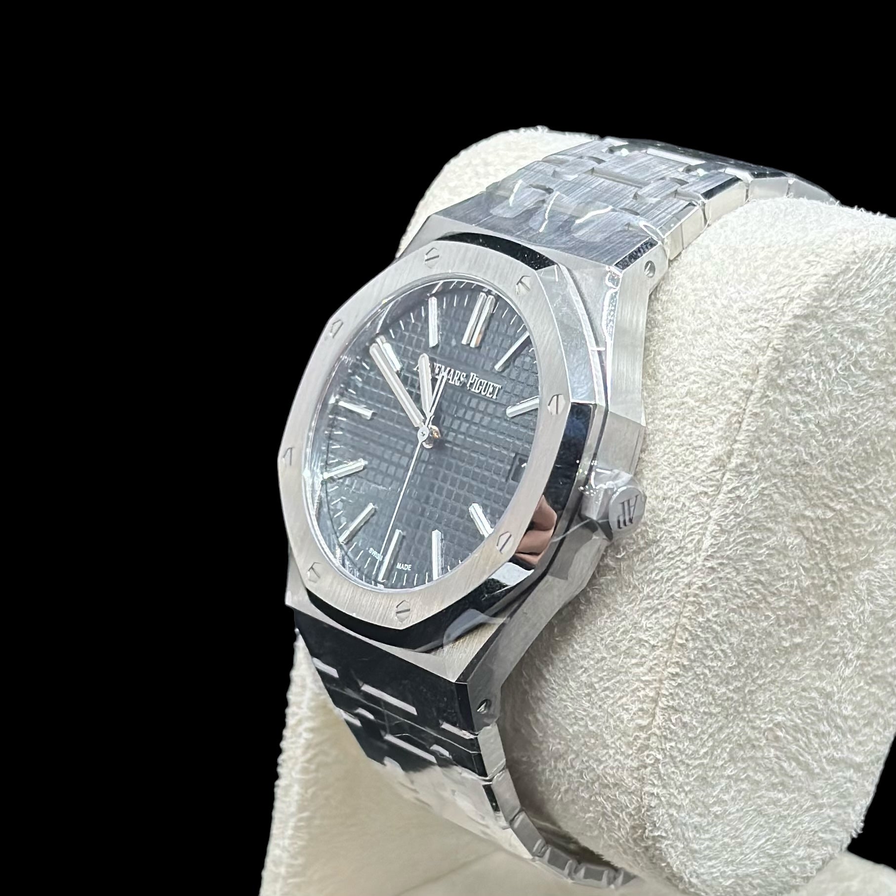 The Audemars Piguet Royal Oak Selfwinding 15510ST.OO.1320ST.01 boasts a 41mm case, offering both durability and a comfortable fit. Its integrated stainless steel bracelet complements the sophisticated aesthetic while providing exceptional comfort and resilience. The practical date display at 3 o’clock enhances its functionality, making it perfect for everyday wear.